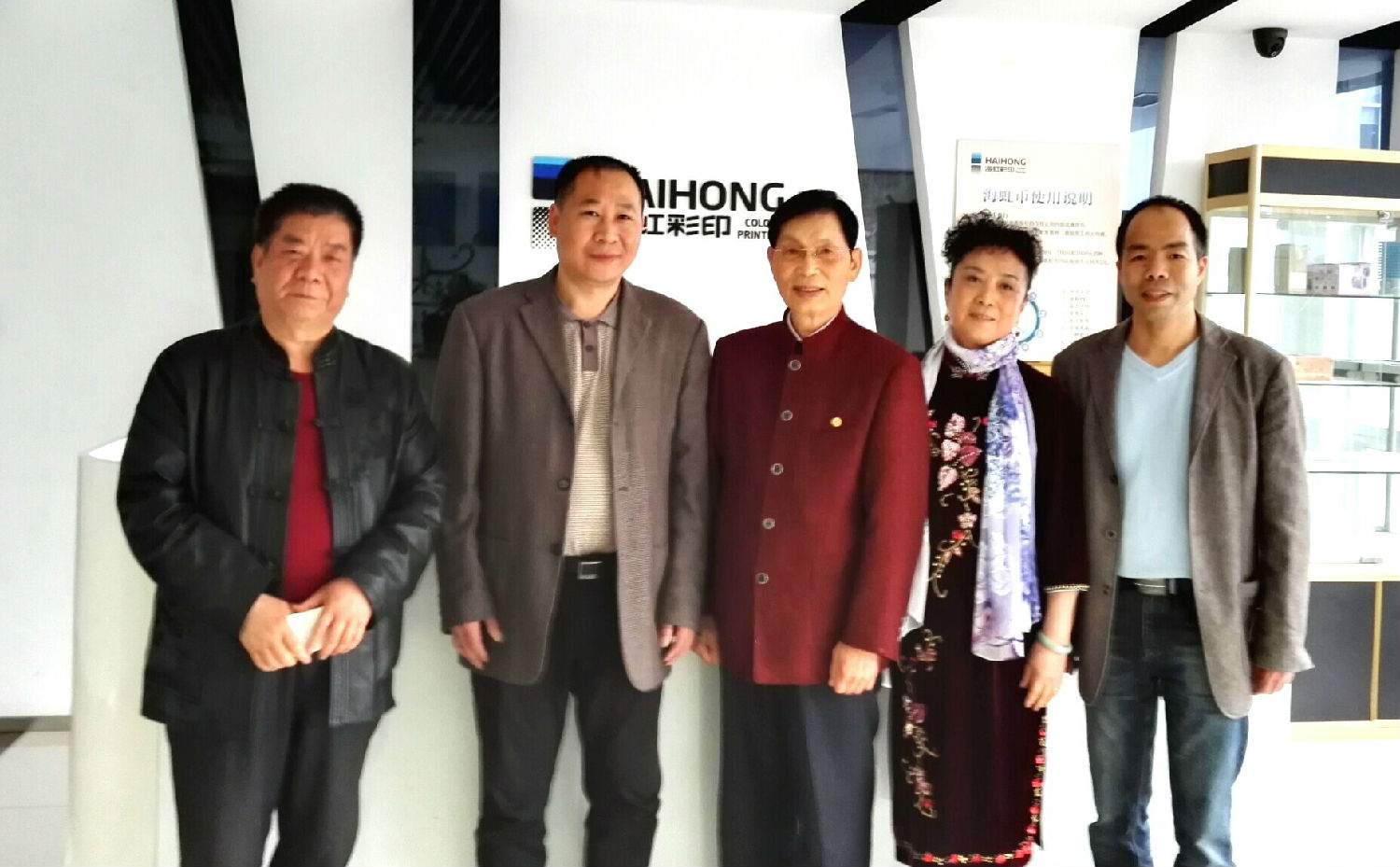 林將軍及夫人與杭州印刷廠海虹彩印盧干進(jìn)盧總在公司誠信墻前合影留念