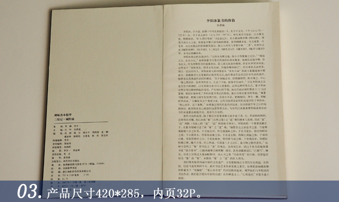 - 封面用薩瓦娜布燙亞金,環(huán)襯用150克CSP特種紙,內(nèi)頁用180克水晶特種紙雙面4色彩印,鎖線精裝+盒裝。